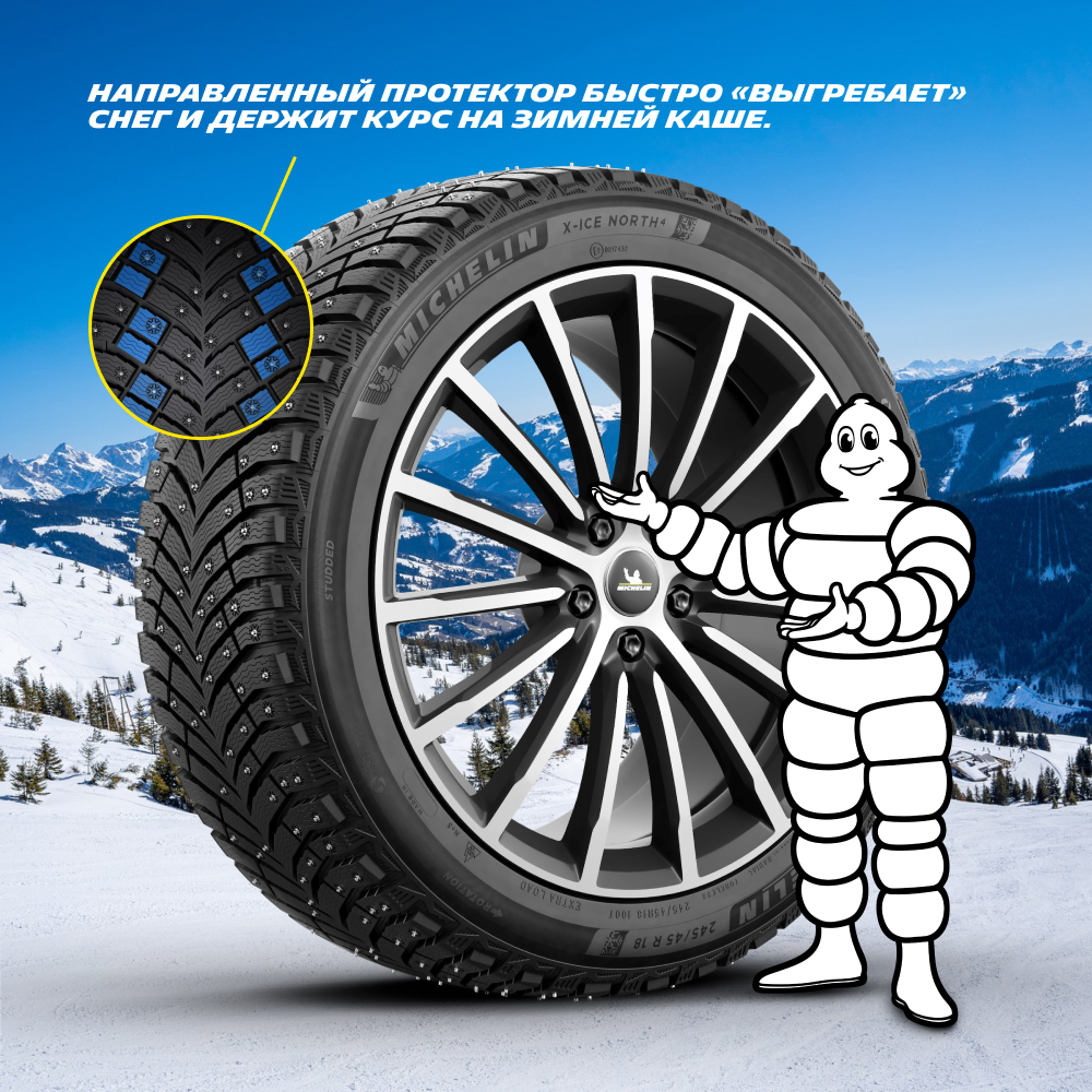 Францияда әзірленген X-ICE North 4 SUV - кроссоверлер мен жол талғамайтын көліктерге арнайы жасалған шегелі қысқы шина. Ең қатал жағдайда да - жалаң мұздан бастап қар басқан тасжолға дейін - максималды ілінісу, сенімділік және басқарылу береді.