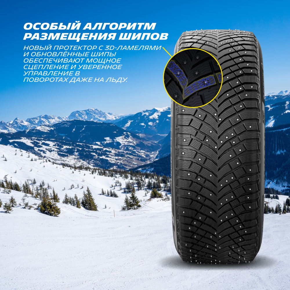 Сотни шипов, расположенных по технологии Michelin Multi-Contact, обеспечивают максимально плотное сцепление с ледяной поверхностью. Уверенное торможение и разгон даже в экстремальные погодные условия.