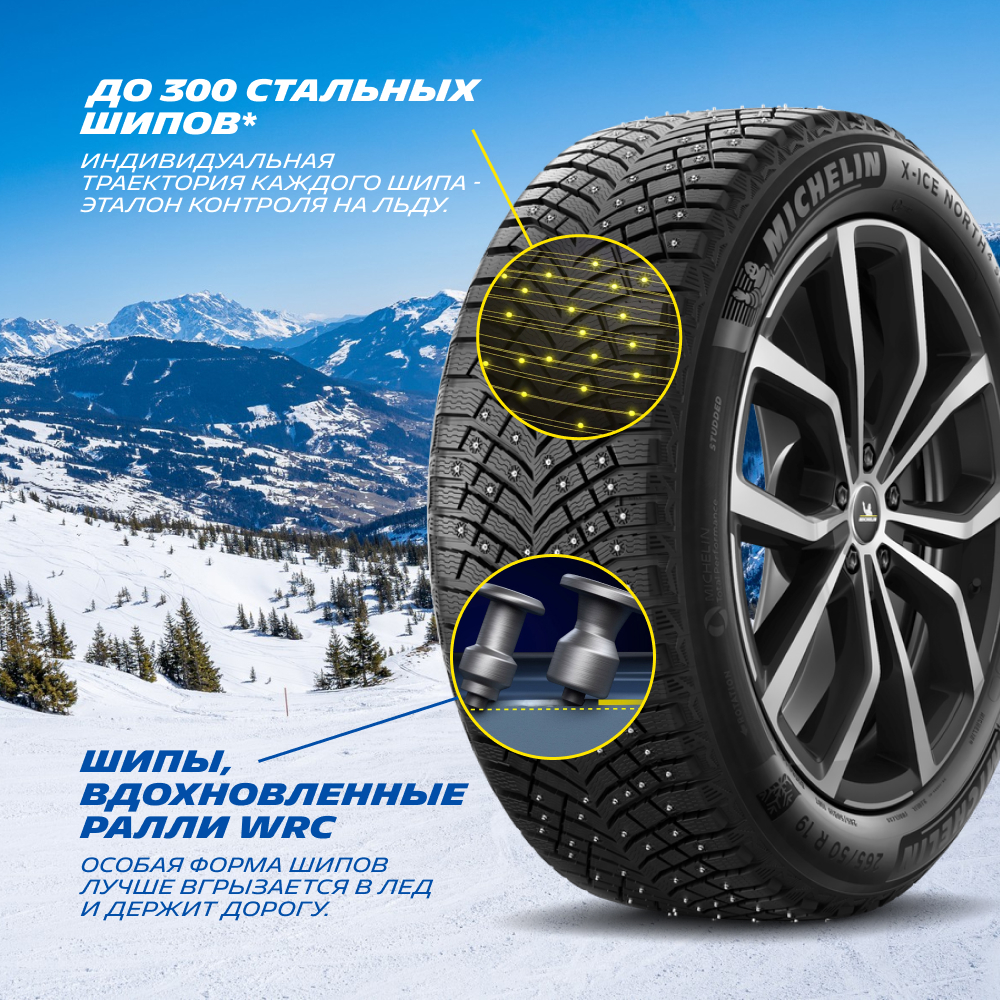 Подробно о технологиях, применяемых в новой зимней шипованной шине Michelin смотрите в обзоре Michelin X-Ice North 4. Больше шипов чем у кого либо