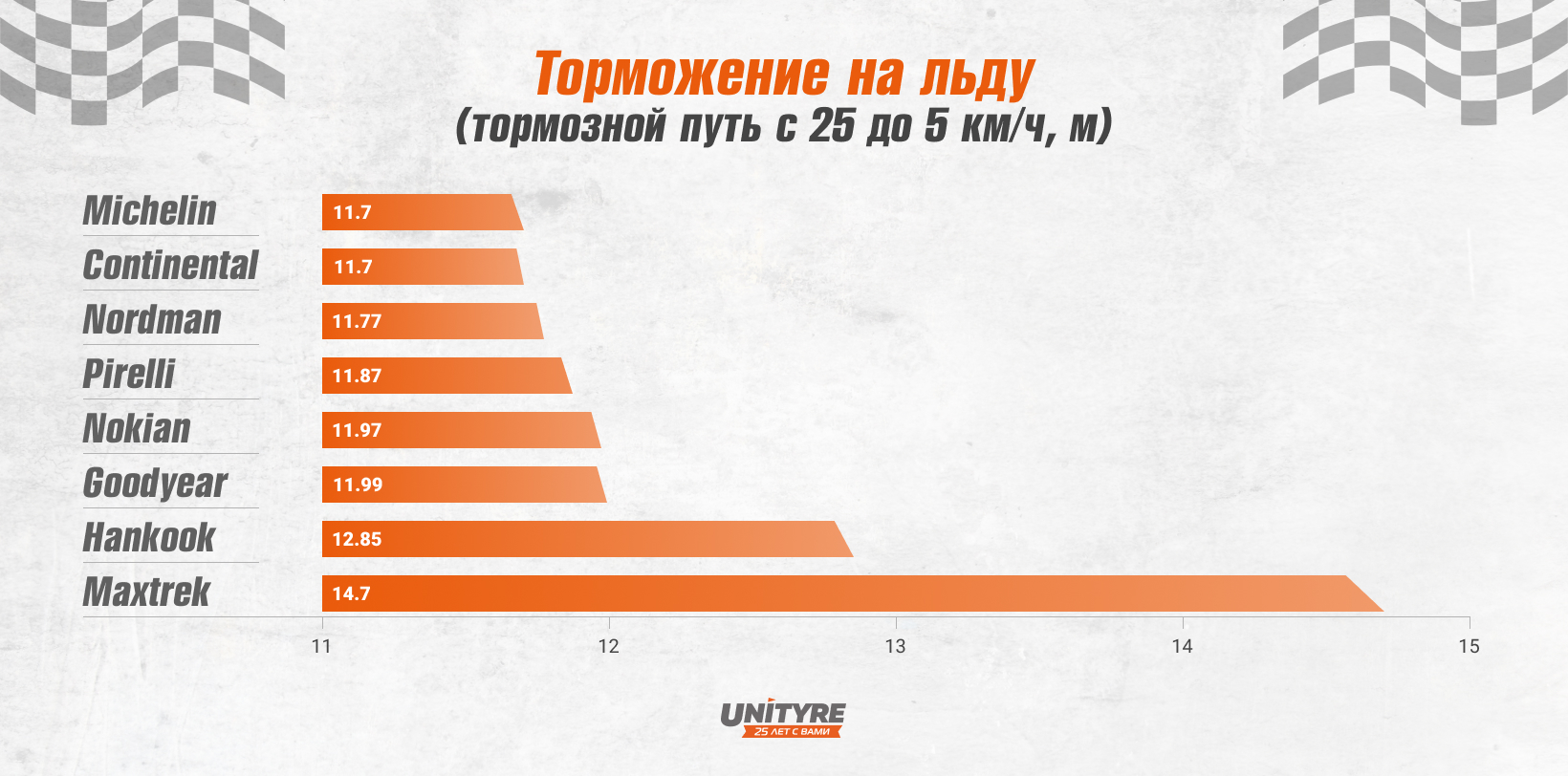 В тестах на торможение на ровном льду первые позиции заняли Michelin и Continental, обеспечив кратчайшие дистанции остановки. Большинство моделей показали достойный уровень, а результаты эконом-сегмента ожидаемо оказались слабее.