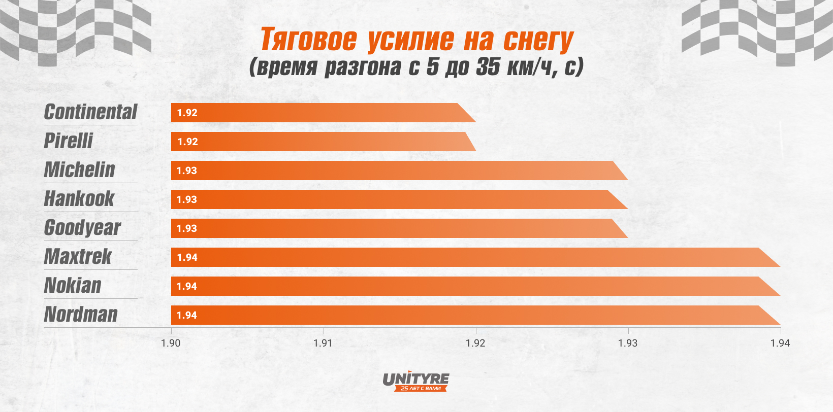 На снежной трассе все шины справились с разгоном уверенно, а минимальный разрыв в показателях выделил Continental и Pirelli как наиболее динамичные.