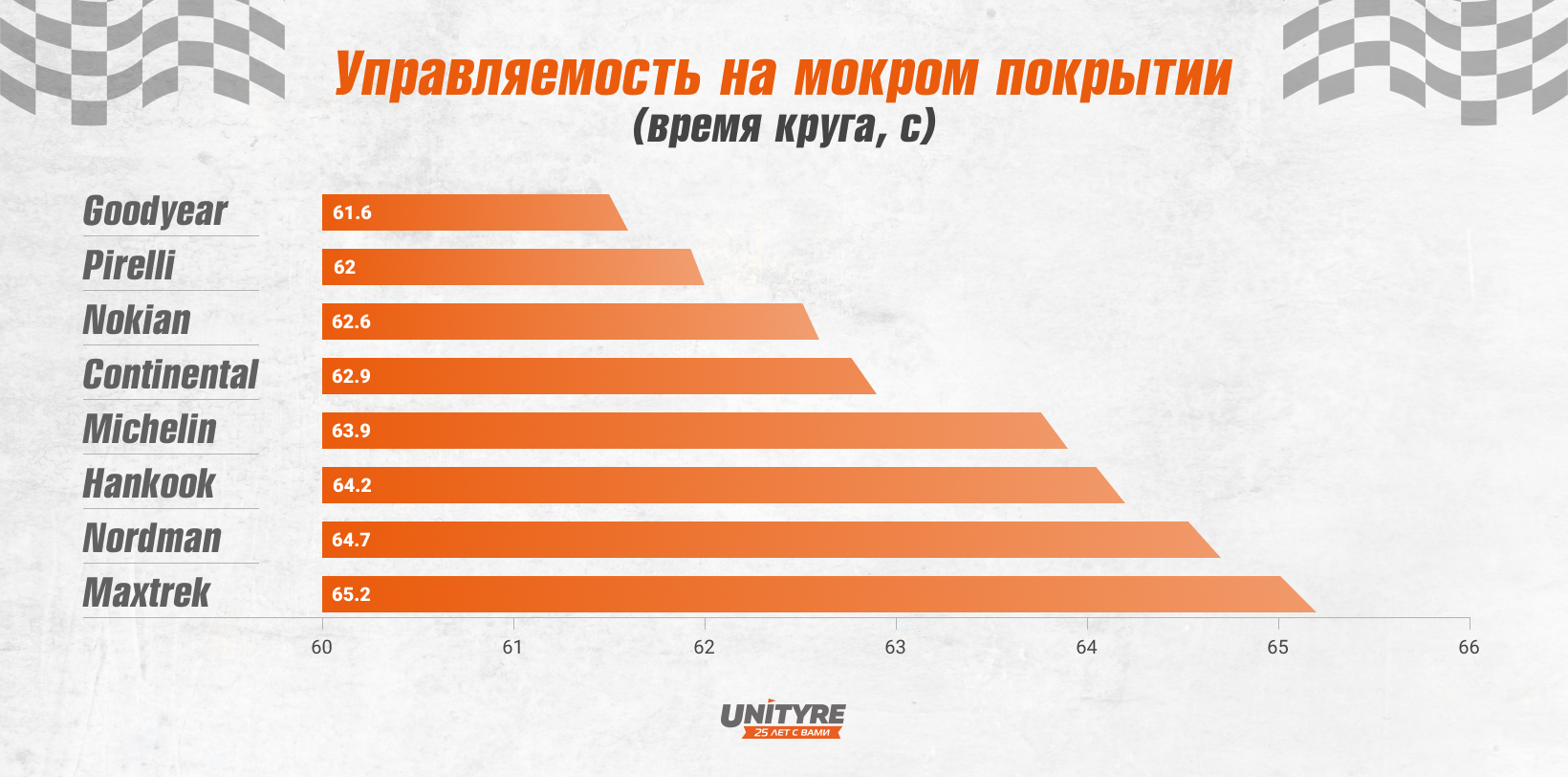 По управляемости на мокром покрытии лидерами стали Goodyear и Pirelli — благодаря стабильности при манёврах и хорошему боковому сцеплению. Nokian также вошли в тройку лидеров.