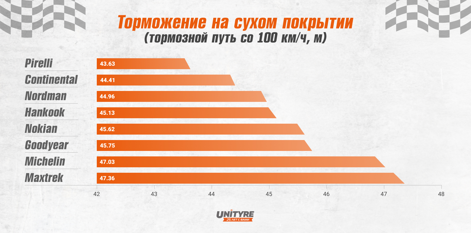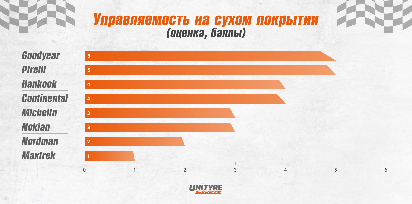 На сухом асфальте лидерами по торможению стали Pirelli и Continental, показав минимальные различия в тормозной дистанции. По управляемости на сухом покрытии лучший результат продемонстрировали Goodyear, сочетая быстрый отклик с устойчивостью в манёврах.