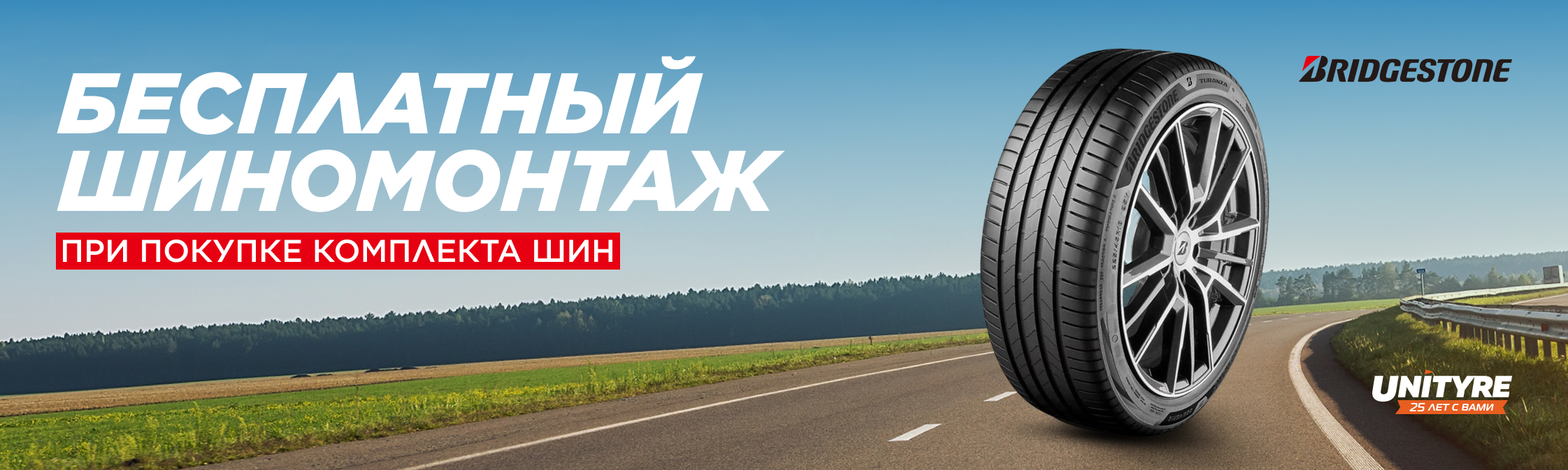 С радостью сообщаем, что с 16 марта 2026 г. по 31 июля 2026 г., купив комплект летних шин BRIDGESTONE в интернет-магазине и шинных центрах UNITYRE в г. Алматы и Астане, вы получаете *бесплатный шиномонтаж!