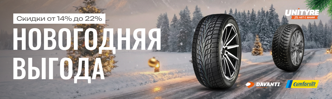 Сеть шинных центров UNITYRE объявляет акцию «Новогодняя выгода»: скидки на зимние шины брендов COMFORSER и DAVANTI - до 22%.