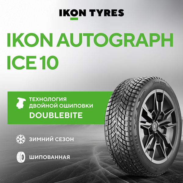 Зимние шины Ikon Autograph Ice 10 обеспечивают уверенность и безопасность на заснеженных и обледенелых дорогах. Предсказуемое торможение и стабильное управление достигается за счет двойной ошиповки DoubleBite и протектору с 3D-ламелями ZiLock. Благодаря специально разработанной резиновой смеси GC Mix управляемость сохраняется даже при низких температурах. Шипованные шины Ikon Autograph Ice 10 созданы для тех, кто ценит контроль и стабильность в зимних условиях.
