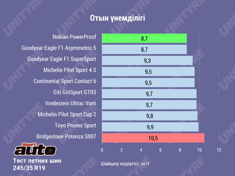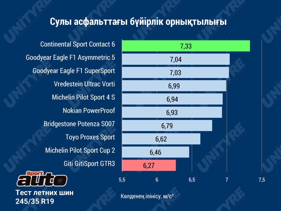 «Құрғақ асфальтта басқарылуы» дисциплинасында көрсеткен нәтижелер күтілген еді: трекке арналған шиналар – топта, одан кейін – екі UUHP-шинасы, төменгі жолақта - UHP-шиналары.
