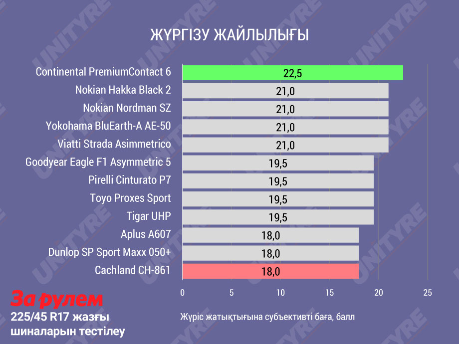 2020 жылдың екінші жазғы тестілеуін «Зарулём» журналы Mercedes-Benz E-Klasse, SLK-Klasse; Audi A3, A4; BMW 3 Series; Hyundai i30; Kia Ceed; Lexus IS 350; VW Golf, Passat; Skoda Octavia және т.б. автомобильдерге жарайтын 225/45 R17 өлшеміндегі шиналардың сынағына арнады.