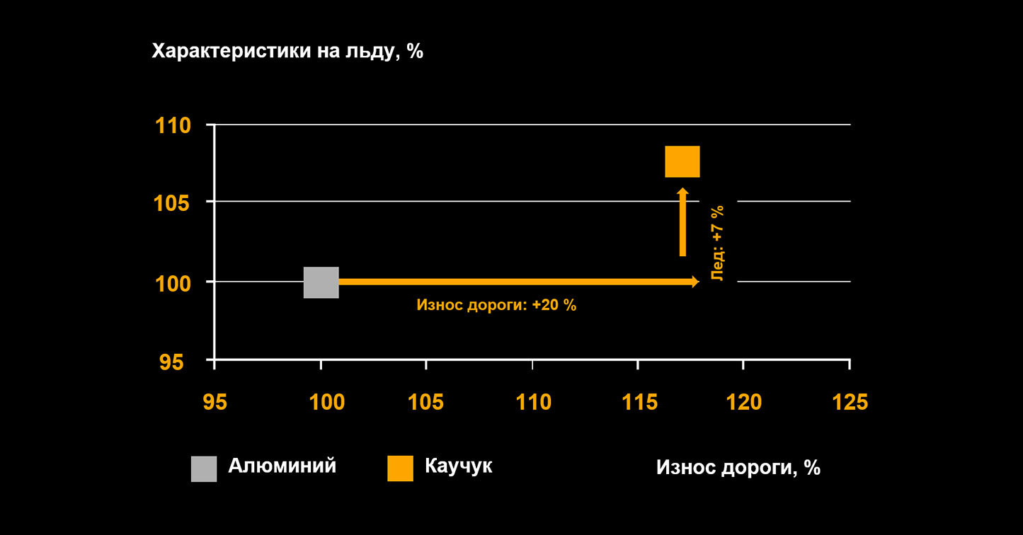 В сцепление на льду — характеристике, определяющей ключевое предназначение шипа — инновационный шип показывает 7% прирост производительности по сравнению с алюминиевым.