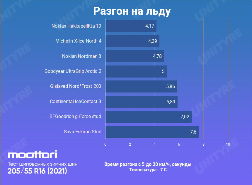 При торможении на льду лучшими были Goodyear, за которыми разместились Nokian, Michelin и Nordman. Шины Continental не вошли в группу лидеров, а тормозной путь BFGoodrich и Sava был охарактеризован как «опасно длинный».
